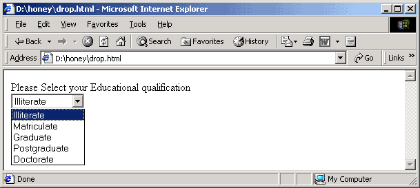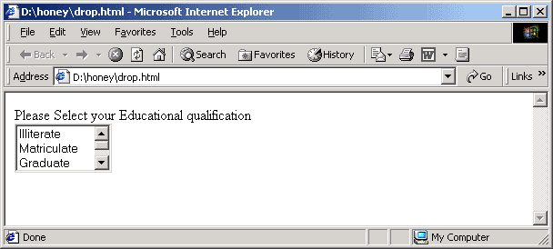In the form, when we click the arrow in the corner of the field, the drop down list appears. When the list is long, it is diffcult to mannabe on the screen for the user. So we can define the number of items in the list to be shown. Other items can be seen by pressing the scroll arrows in the list. This is done using the size attribute. Suppose we want only three items to apper on the list. then we can give the <select name = qualification size =3>