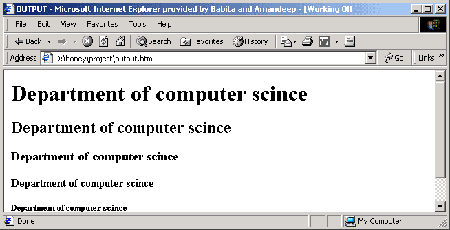 In HTML we can print headings using any one of the six tags<h1>, <h2>, <h3>, <h4>, <h5> or <h6>, <h1>, denoting the largest size heading. When we give the <H2> tag the heading is smaller. The <H3> tag makes a still smaller heading. Consider the following HTML documents
